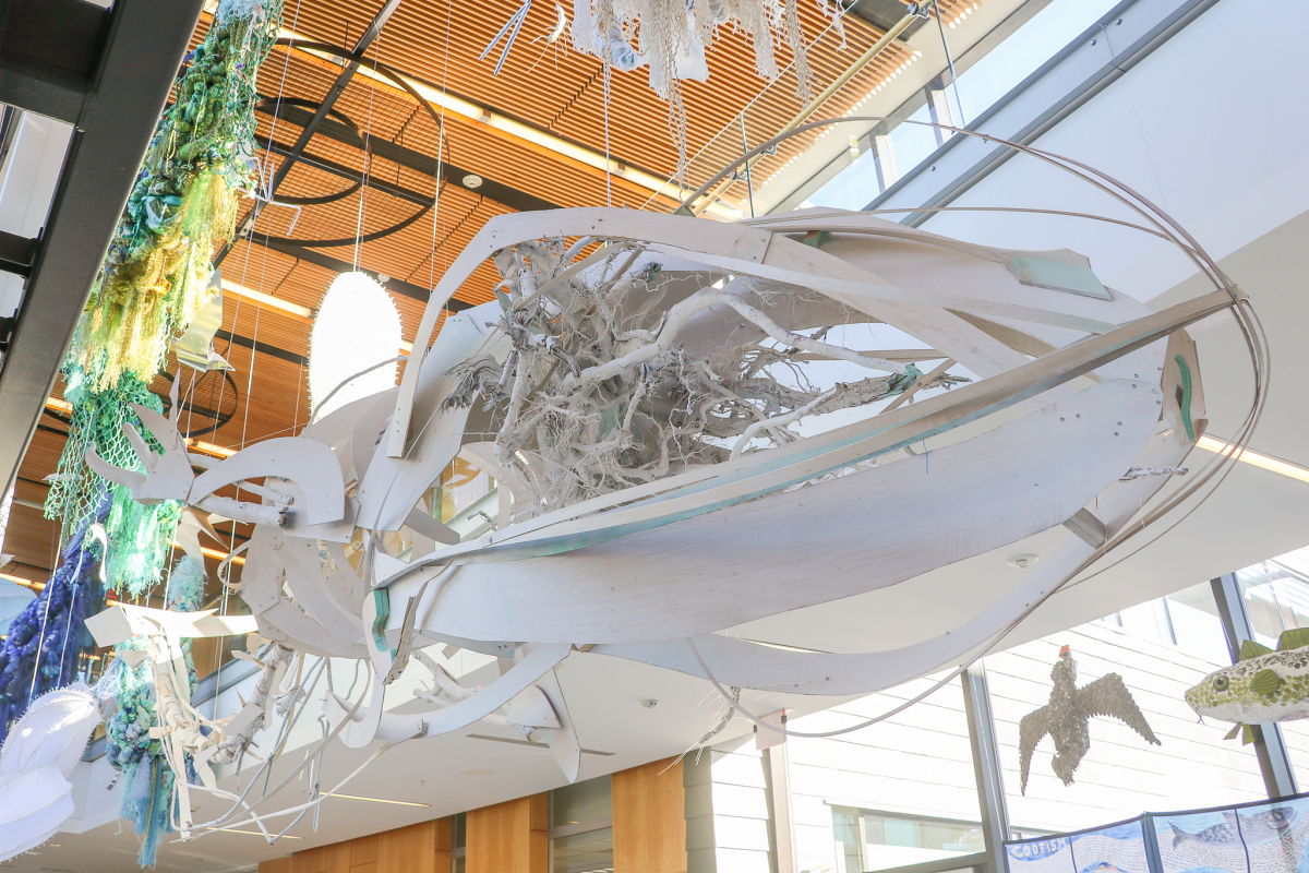Anna Dibble and other artists from Maine EcoArts will talk about their two-story installation “Majestic Fragility,” which was created in collaboration with Senior Research Scientist Nick Record. The installation, currently on display at Bigelow Laboratory, celebrates ocean life and the scientific efforts to understand it. It is the culmination of a three-year project and features a range of key endangered and threatened marine life from phytoplankton to birds in sculpture, textile art, and prints. At its center is a bone-white, 24-foot sculpture of a North Atlantic Right Whale, one of the most endangered species on the planet.